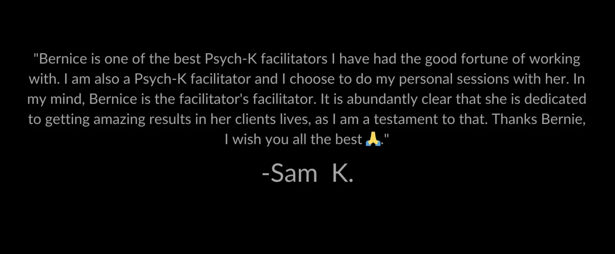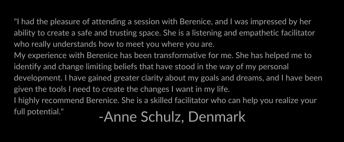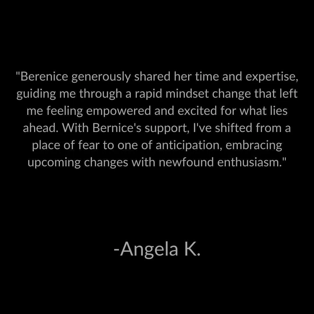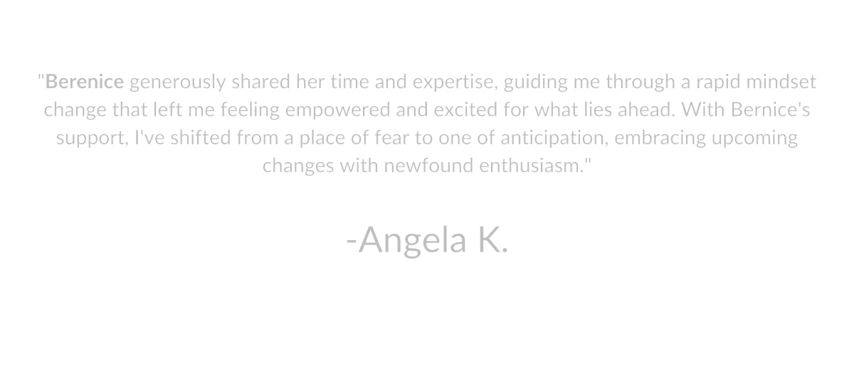 "Berenice generously shared her time and expertise, guiding me through a rapid mindset change that left me feeling empowered and excited for what lies ahead. With Bernice's support, I've shifted from a place of fear to one of anticipation, embracing upcoming changes with newfound enthusiasm."