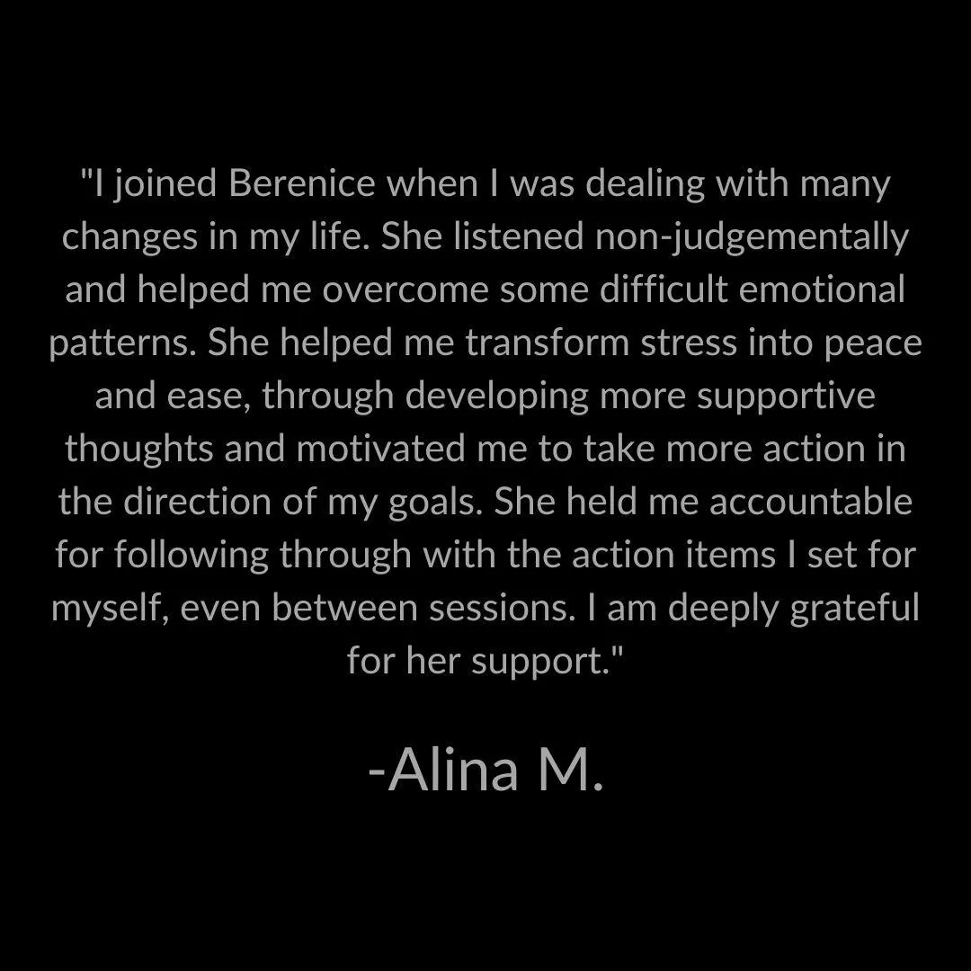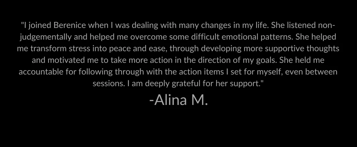 "I joined Berenice when I was dealing with many changes in my life. She listened non-judgementally and helped me overcome some difficult emotional patterns. She helped me transform stress into peace and ease, through developing more supportive thoughts and motivated me to take more action in the direction of my goals. She held me accountable for following through with the action items I set for myself, even between sessions. I am deeply grateful for her support."